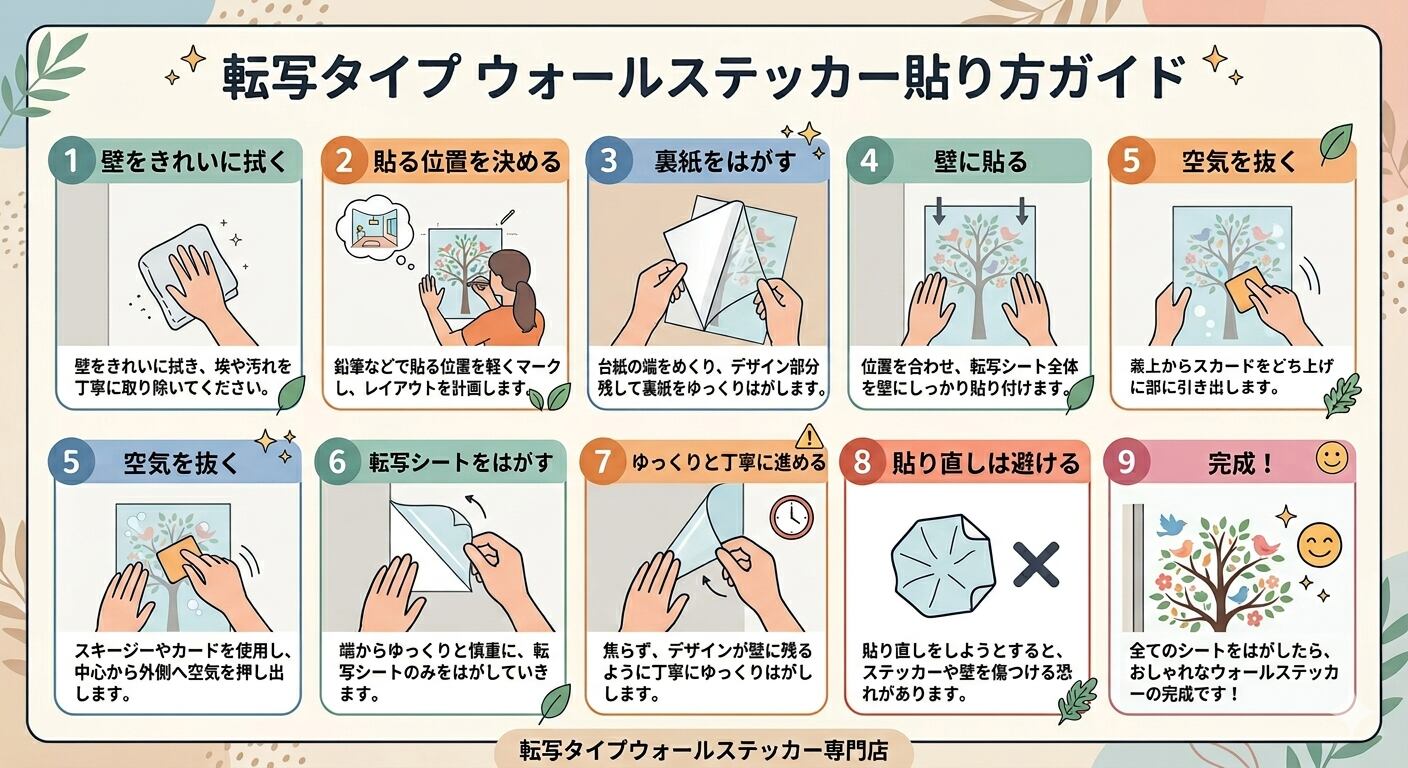 このタイプは転写仕様なので、文字が壁に直接なじんだように見え、完成後の見た目がとても自然です。また、ポスターのように紙の反りやテープ跡を気にしにくいため、長く楽しみたい壁装飾としても使いやすいです。