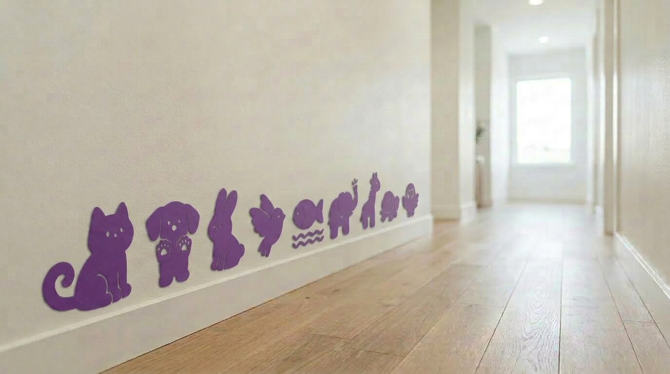 Earthbeastのミニドアデコレーションシリーズは、扉の横にさりげなく飾れる、小さめサイズの壁用ステッカーです。約8cm前後のコンパクトなサイズ感で、主張しすぎず、空間にやさしいアクセントを添えてくれます。9個セットなので、並べて使うことで統一感のあるかわいい雰囲気を演出できます。